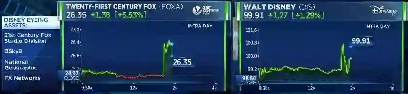 从金融市场的反应来看,这一观点也为华尔街方面所认同。11月初并购案的消息初次传出时,21世纪福斯与迪士尼的股价双双应声上扬,甚至有分析师将这一联手形容为“美梦成真”。