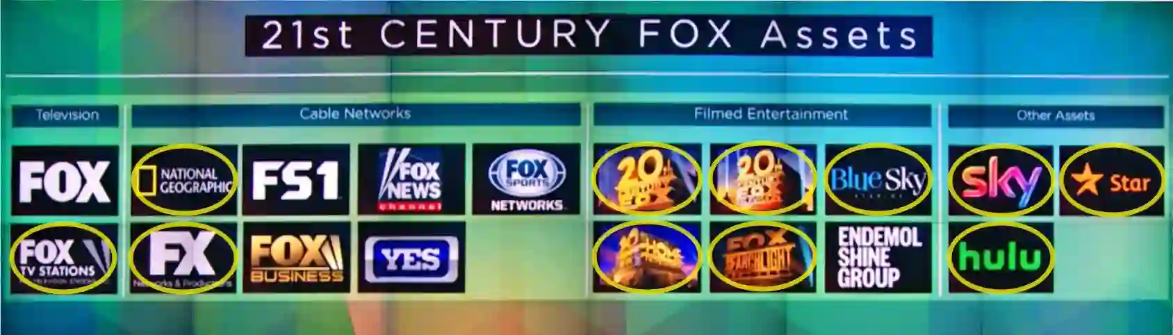 黄圈标出的是目前明确已知将被迪士尼收购的21世纪福斯资产