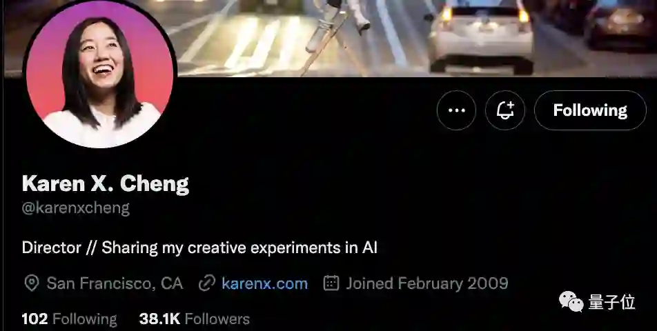 在Karen X.Cheng的个人简介上,就很直白的写着:导演,分享她的AI创意实验。