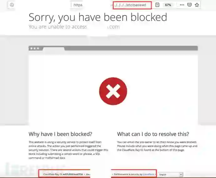 测试刚开始,我注意到目标系统的一个服务路径(Endpoint)会与一些后台的文件系统进行交互,因此接下来我就自然而然地测试了本地文件包含漏洞(LFI),之后发现,目标系统应用受Cloudflare WAF防火墙保护。如下: