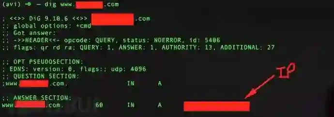 当然了,这里我们要来先发现目标应用系统的真实IP,我简单地执行 “dig www.readacted.com” 命令,竟然就找到了: