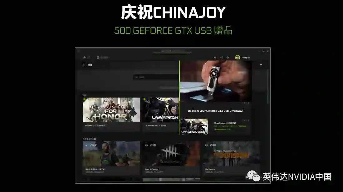 NVIDIA也一直通过GeForce Experience为用户带来特殊的礼物。为了庆祝在ChinaJoy上的发布,我们提供了500个GeForce GTX U盘给中国的玩家,认证并登陆GeForce Experience去感受全新的功能吧!