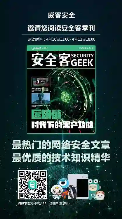 4月10日,安全客2018季刊—第1季再度上线,我们对文章的质量严格把关,对品质始终恪守不渝,只愿为安全爱好者带来最好的干货!从4月10日的11点到4月12日的18点,我们还将放送出1000+份定制好礼,赶快下载安全客最新APP,来一起参与吧!