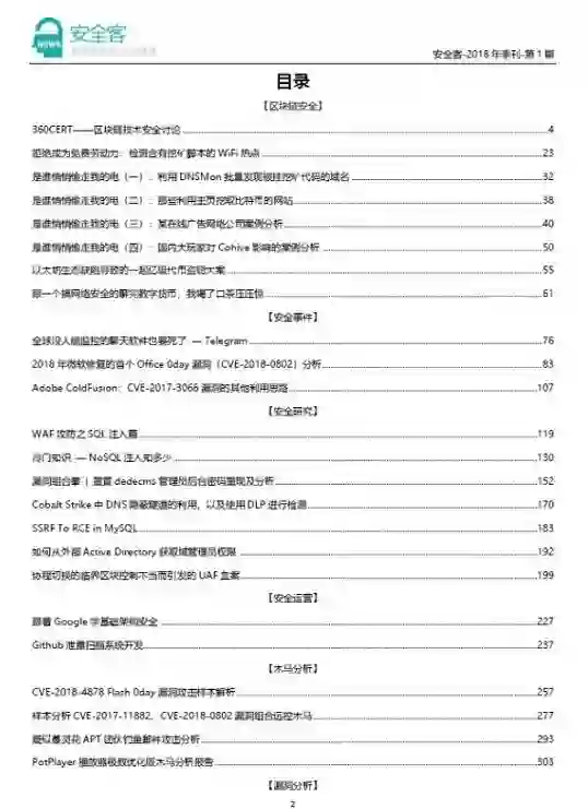 此次季刊收录了来自多个安全平台的三十篇优秀技术文章,涵盖公众讨论最火热的区块链安全、安全事件、安全研究、安全运营、木马分析、漏洞分析等六大季度热点方向,精彩程度不容错过!