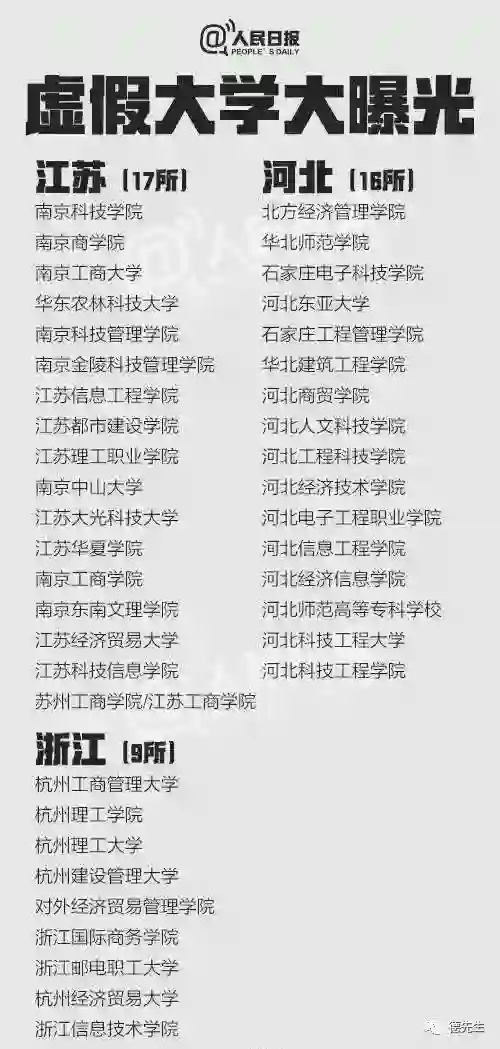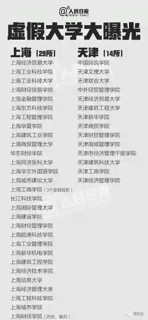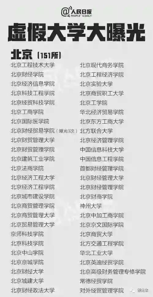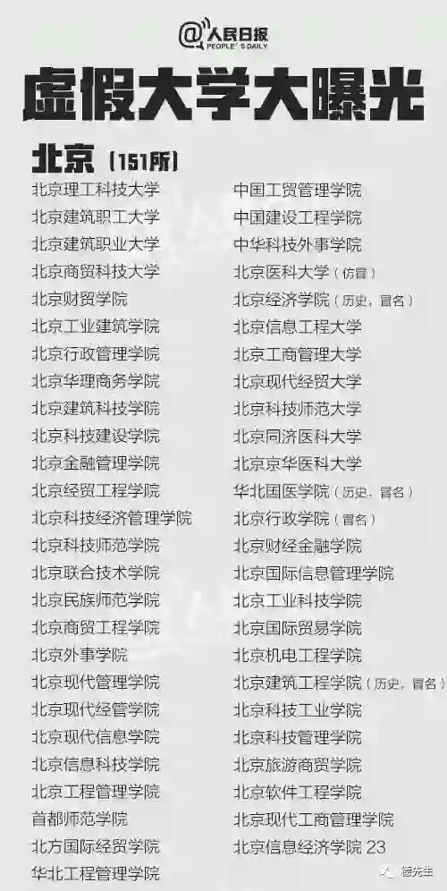 在这些“野鸡大学”中,北京共有151所。我们发现,“野鸡大学”的名字都和正规大学相差无几。比如,把北京邮电大学改成“中国邮电大学”,反而更显高端;把中国传媒大学改成“中国传媒艺术学院”,反正,传媒和艺术是紧挨在一起的。