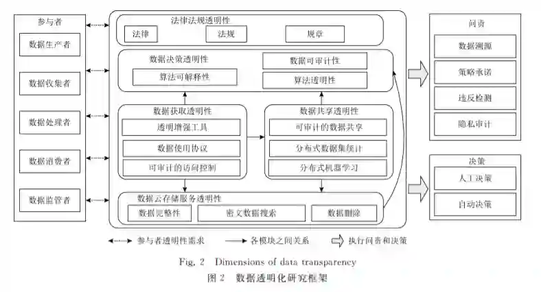 增加大数据价值实现的透明性,是促进大数据 正确使用的重要举措和必经之路.据此,本文提出数 据透明性的概念,指在大数据价值实现过程中,各个 参与方都能获取与自身相关的全部数据信息.并将 数据透明性分为数据获取透明性、数据共享透明性、 数据云存储服务透明性、数据决策透明性和法律法 规透明性5个部分,通过这5个部分实现数据透明 化.数据透明化需要公开透明地记录数据的获取和 共享流通等信息,以及去中心化地管理数据和执行 数据质量管理.这些需求与区块链的特性天然契合, 而且区块链的去中心和不可篡改特性使数据透明化 具有更强的问责能力.