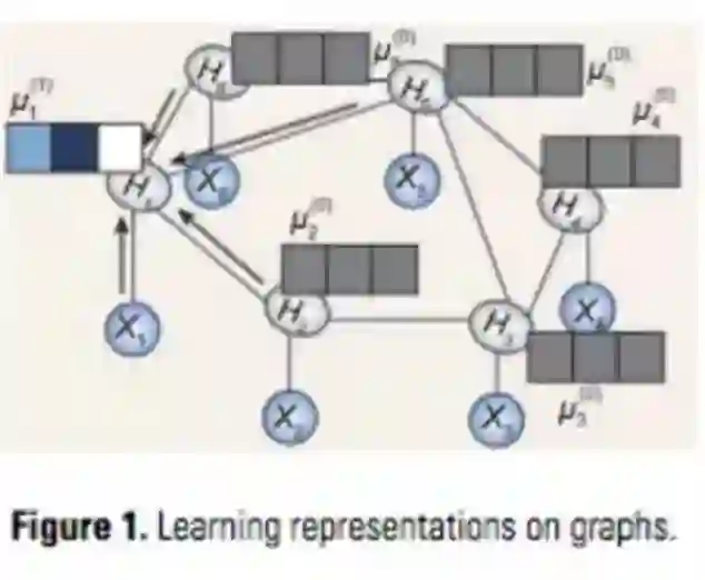 有人最近提出一种叫做Structure2Vec的方法【3】,它将实体(即节点)嵌入欧式空间中,这种方法融合了概率图模型和深度学习的想法。图1展示了其基本思想,其中每个节点X_i都与一个潜在变量H_i相关联。一般的,潜在变量H_i是随机的,整个H集合服从联合概率分布 p(H|X) 。还有一个问题是如何寻找单个变量或一组变量的边缘分布,解决类似这样的问题,我们需要在图上使用消息传递算法(message-passing algorithms)(例如mean-field以及信念传播),这种方法可以影响紧凑依赖结构(compact dependence structure)。Structure2Vec的思想来自于消息传递算法,不同于进行概率推导,它针对每个节点学习到一个特征向量μ_i∈R^d,而后在局部更新规则下进行消息传递,这种算法是迭代进行的,开始时赋予μ初值。在进行第t次迭代时,它使用来自相邻节点的局部信息更新每个节点i的特征向量: