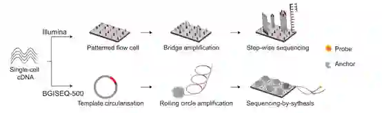 到目前为止,在单细胞转录组研究中广泛使用的是Illumina测序平台,要求绝大多数cDNA扩增与测序文库构建方法与其相兼容。而华大的BGISEQ-500平台提供了另一种短读段测序策略,区别于Illumina系统,构建了DNA纳米球微阵列(DNA nanoball)测序技术(DNBSEQ™)进行测序。