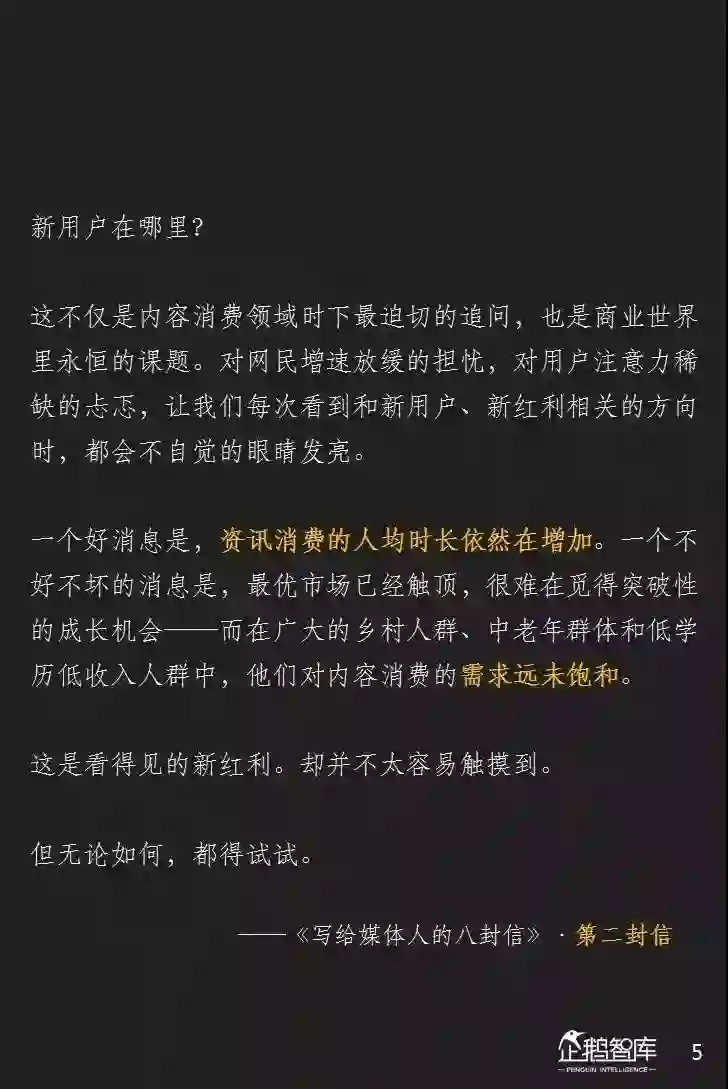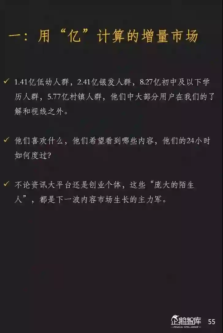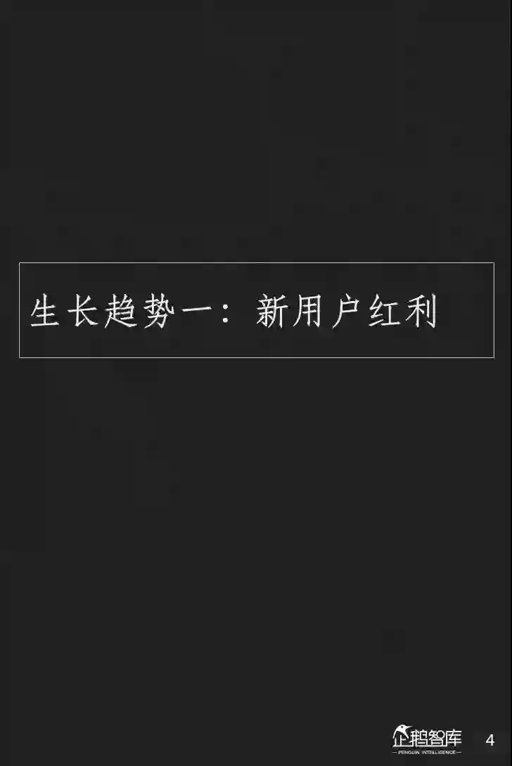 生长趋势一:新用户红利。在广大的乡村人群、中老年群体和低学历低收入人群中,他们对内容消费的需求远未饱和。