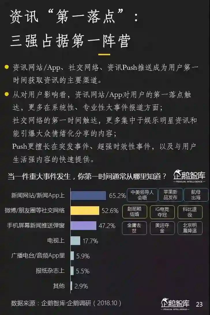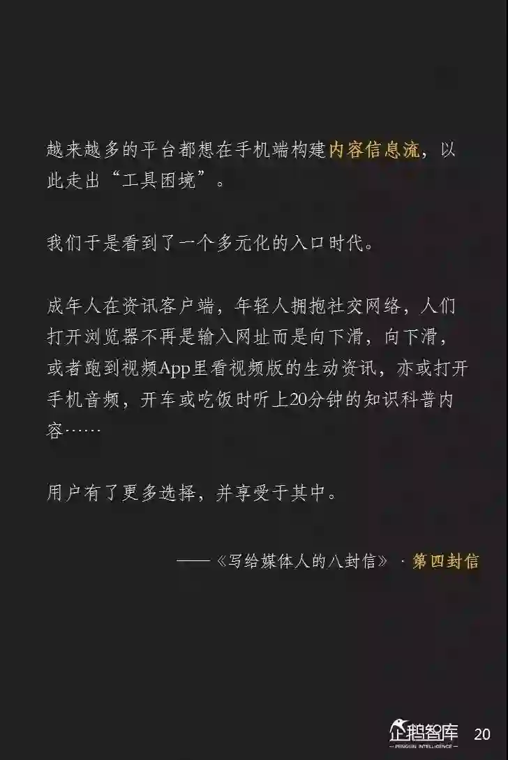 企鹅智库连续第六年发布中国新媒体趋势报告,此次报告中总结的媒体生存核心趋势如下: