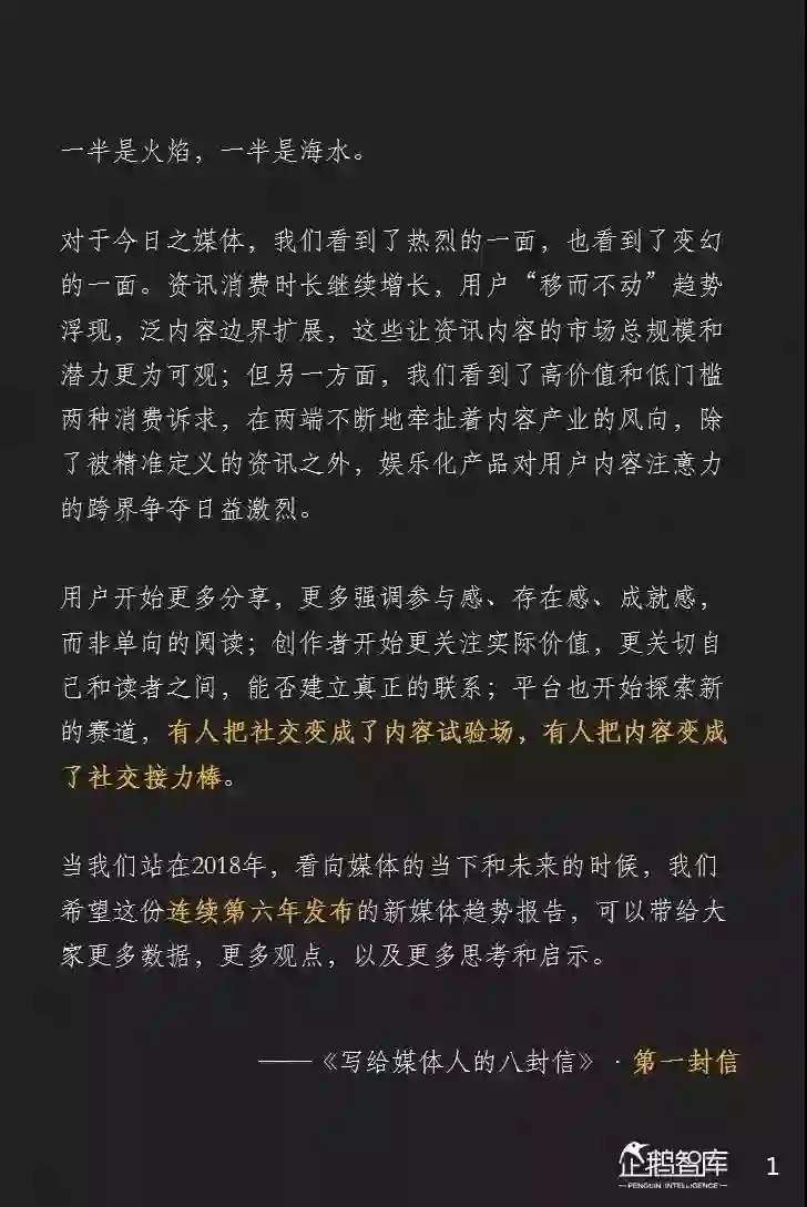 当我们站在2018年,看向媒体的当下和未来的时候,我们希望这份连续第六年发布的新媒体趋势报告,可以带给大家更多数据,更多观点,以及更多思考和启示。