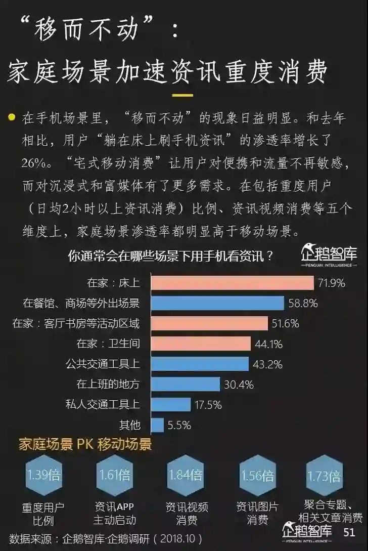 生长趋势七:创新风口,在手机场景里,“移而不动”的现象日益明显。71.9%用户“躺在床上刷手机资讯”。
