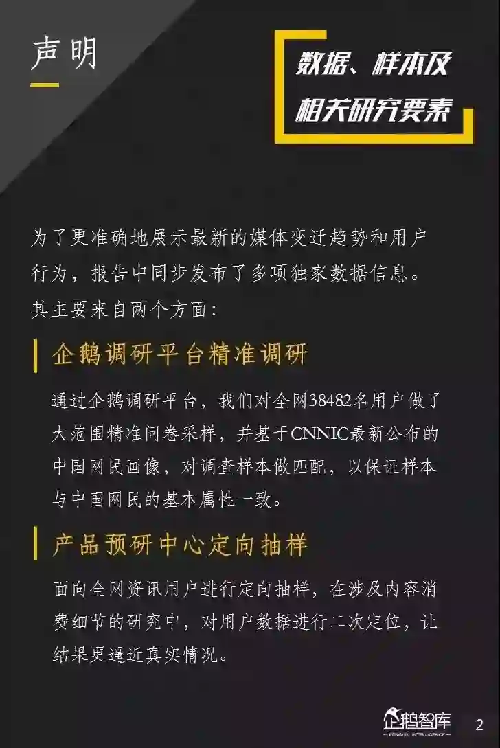 报告由腾讯企鹅智库连续第六年独家研究发布。报告中49组首发数据,除部分来自于第三方统计机构之外,大部分数据都来自企鹅智库·企鹅调研平台对来自全国38482名网民的大范围精准问卷采样,覆盖全国所有省级行政单位和各级地域分布。并基于CNNIC最新公布的中国网民画像,对调查样本做匹配,以保证样本与中国网民的基本属性一致。