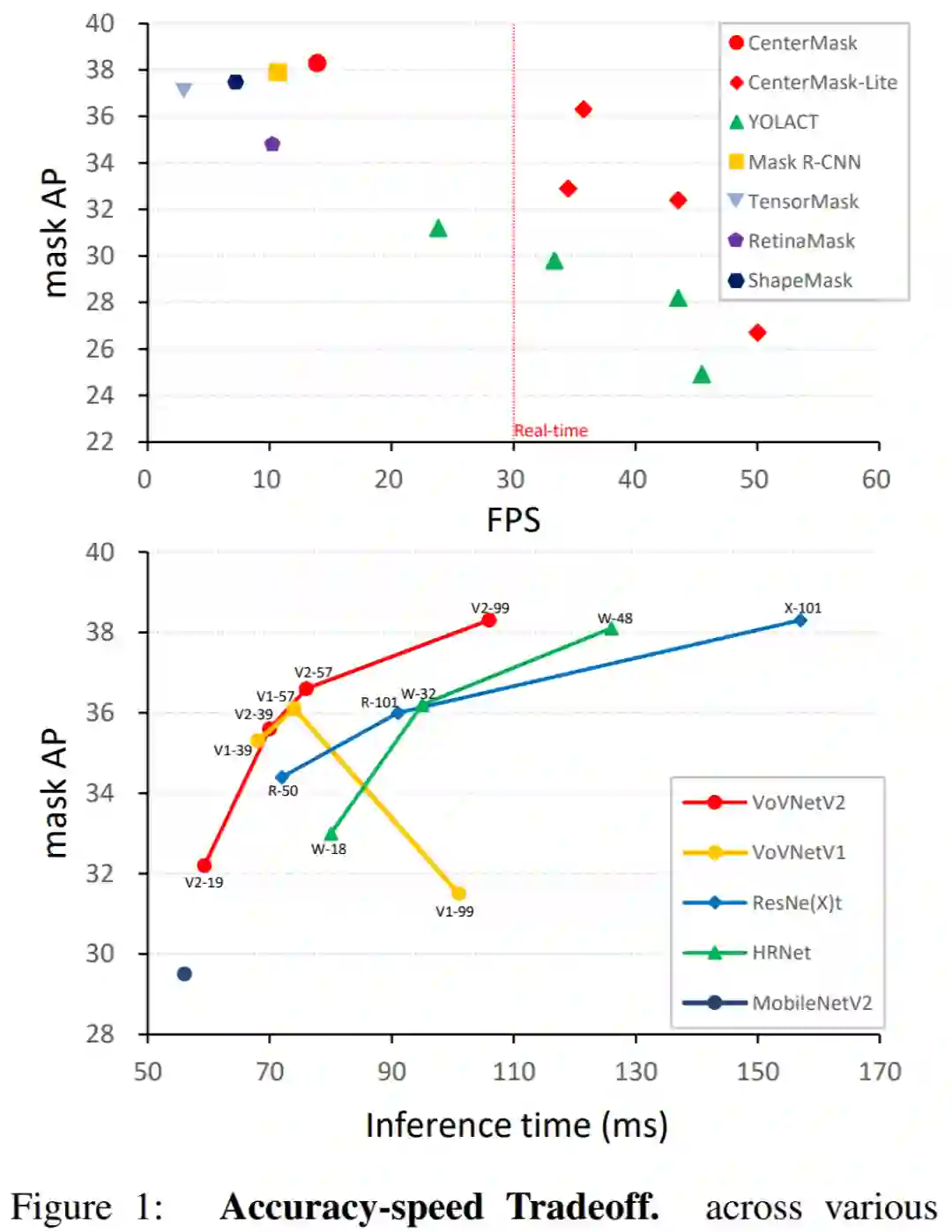 ,它具有两种有效的策略:添加(1)残差连接以解决VoVNet的饱和问题,以及(2)有效的Squeeze-Excitation(eSE)处理原始SE的信息丢失问题。借助SAG-Mask和VoVNetV2,我们分别设计了针对大型模型和小型模型的CenterMask和CenterMask-Lite。 CenterMask以更快的速度超越了所有以前的最新模型。CenterMask-Lite还实现了33.4%的mask AP / 38.0%的box AP,在Titan Xp上以超过35 FPS的速度分别比最新技术提高了2.6 / 7.0 AP增益。我们希望CenterMask和VoVNetV2可以分别作为用于各种视觉任务的实时实例分割和骨干网络的坚实基准。