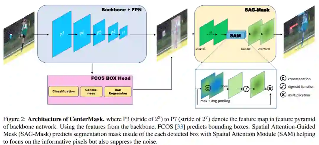 本文提出了一个简单而有效的anchor-free实例分割网络,称为CenterMask,它使用Mask R-CNN在同一vein中向anchor-free one stage目标检测器(FCOS)添加了一个新的空间注意力map(SAG-Mask)分支。插入FCOS目标检测器后,SAG-Mask分支将使用空间注意力map预测每个box上的分割mask,以帮助关注像素信息并抑制噪声。