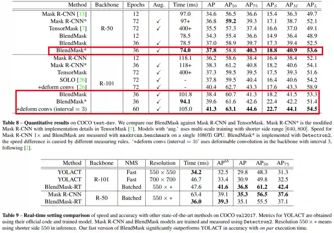 注:BlendMask实例分割新网络在COCO上,性能可达34.2mAP/25FPS!性能优于TensorMask、SOLO和Mask R-CNN等网络,其轻量级版本与YOLACT各有优点