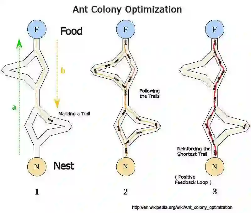 蚁群利用一个复杂的算法确定了最短路径。早在蚁学家用语言记下这种现象之前,蚂蚁就很好地运用了这个进程。