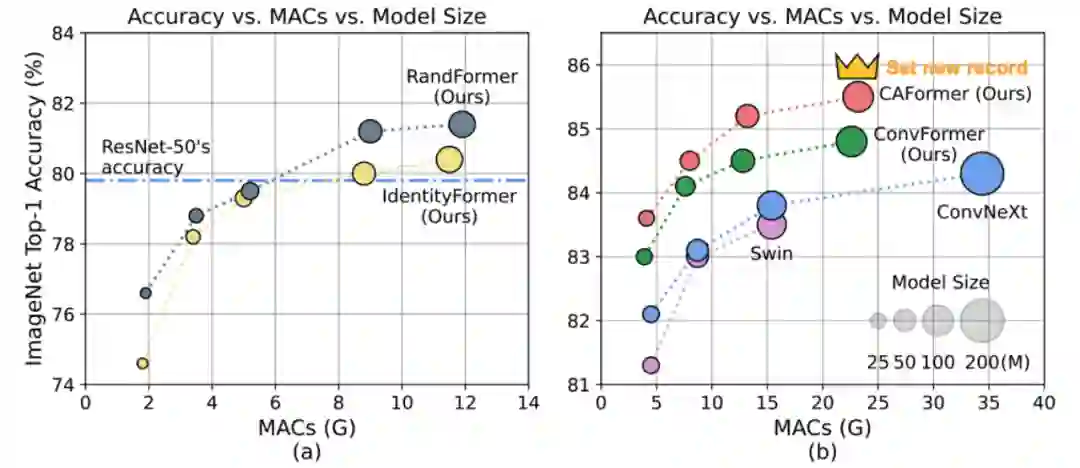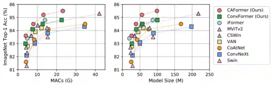 CAFormer 刷新 ImageNet 记录。通过将四阶段模型的前两个阶段的 token mixer 设置为可分离卷积,后两个阶段设置为原始的 self-attention,所衍生模型 CAFormer 在 ImageNet 无额外数据常规有监督训练下,在 224x224 分辨率上创造 85.5% 准确率的新纪录。