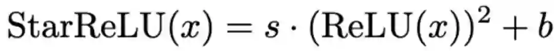4. 新型激活函数 StarReLU 超越 GELU。此外,作者还提出了新型激活函数 StarReLU 用以取代常用的 GELU 激活函数。该函数为平方 ReLU 的变体,为消除分布偏移而设计。StarReLU 每个神经元仅需 4 FLOPs,相比 GELU (14 FLOPs)减少了 71% 的计算量,却取得更好的性能。ConvFormer-S18 模型在 ImageNet 数据集上,使用 StarReLU 相比 GELU 准确率提升 0.3%,相比 ReLU 提升了 0.9%。