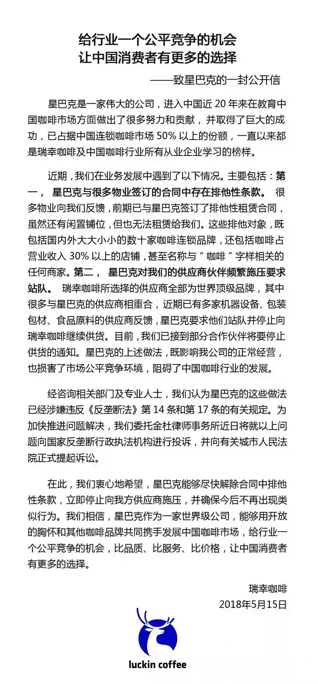 5月15日,咖啡连锁业后起之秀瑞幸咖啡(luckin coffee)发表公开信称,在实际业务发展的过程中遭到星巴克的垄断性竞争,并表示星巴克对瑞幸咖啡的供应商伙伴频繁施压要求站队。下午,星巴克中国做出回应,称中国咖啡市场体量巨大,竞争充分,发展迅速;无意参与其他品牌的市场炒作,欢迎有序竞争。