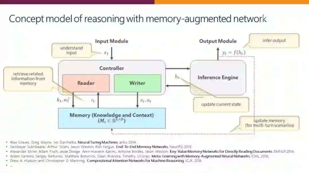 支持推理的典型框架称为“记忆增强神经网络(MANN)”。给定输入话语, MANN 首先通过将其转换为向量表示来理解它;然后,Reader 使用输入表示和先前状态从存储知识和上下文信息的存储器中检索相关信息;接下来,MANN 基于先前状态和检索到的信息更新当前状态,基于此,还通过整合当前状态的信息来更新存储器;最后,在几轮迭代之后,推理引擎得到最终输出结果,该输出结果也将用于更新存储器以支持下一轮的理解。
