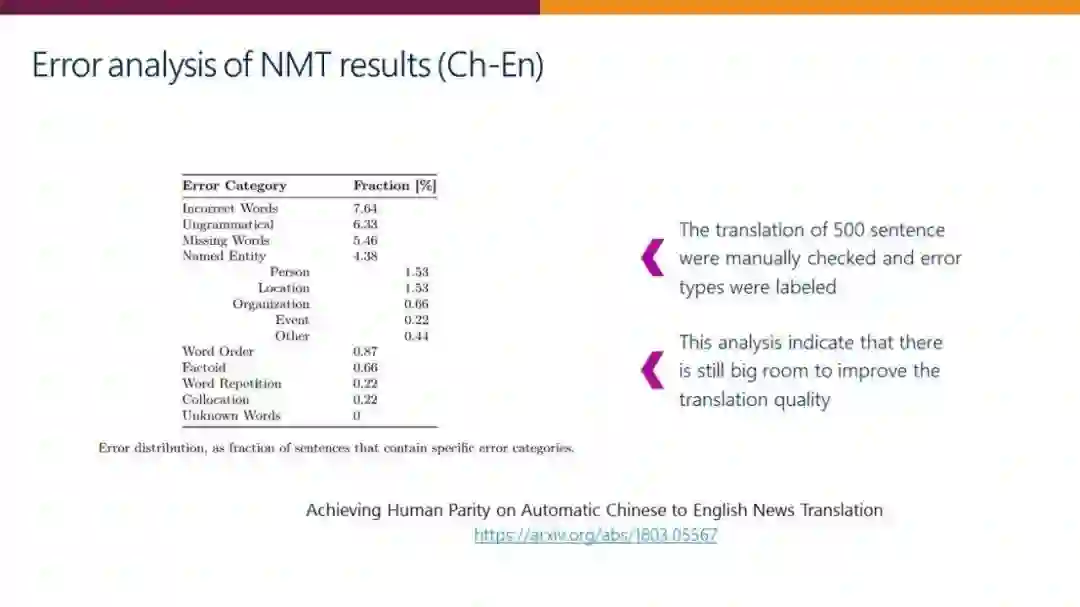 首先,针对资源丰富的 NLP 任务,我们以中英机器翻译为例说明目前存在的问题。首先做一个中-英神经网络机器翻译错误分析。