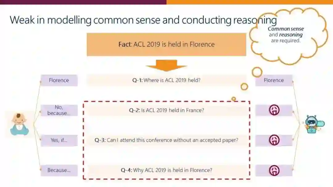 在这个例子中,鉴于“ACL 2019在佛罗伦萨举行”的事实存储在知识库中,计算机可以回答第一个问题,而对于小孩子来说很简单的后三个问题,计算机却不知道该怎么回答。其原因在于目前的自然语言处理还没有很好地解决常识和推理的问题。