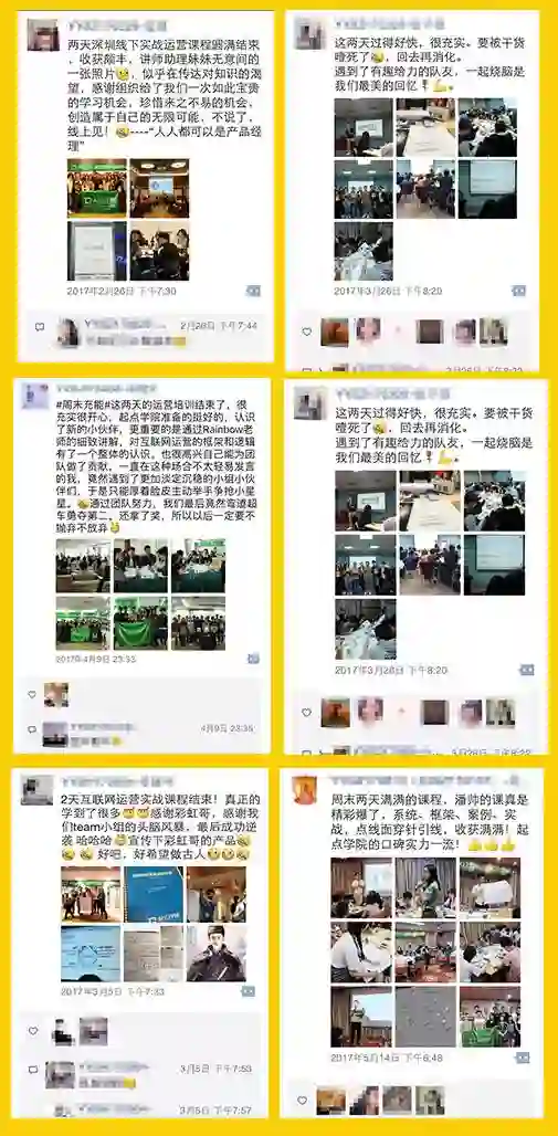 在互联网运营实战训练营2天线下+365天线上的学习中,你将和来自各行各业优秀的运营人成为同学,共同完成实战作业,碰撞思维火花,不仅能拓宽看问题的视野和思路,还能收获精准人脉。