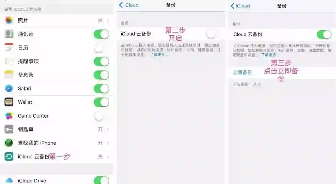 打开“系统设置- iCloud - iCloud 云备份-打开开关-点击立即备份即可。