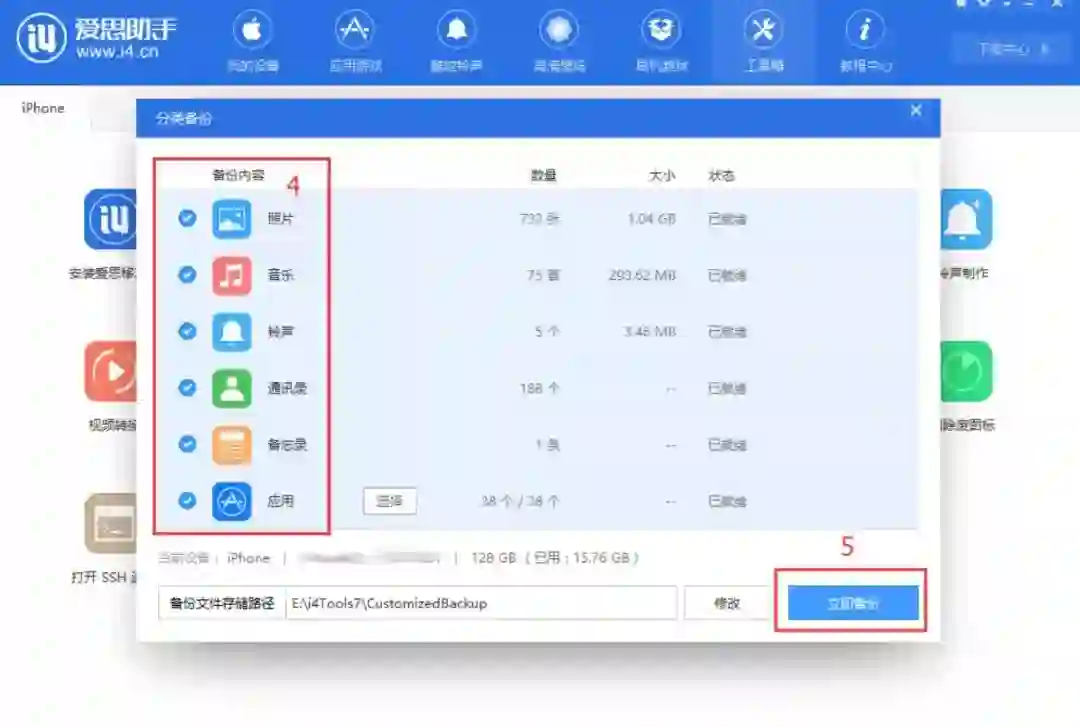 操作步骤:打开爱思助手 PC 端,将移动设备连接到电脑,点“工具箱-备份/恢复-分类备份”,在分类备份界面选择自己需要备份的内容后,点“立即备份”按钮。