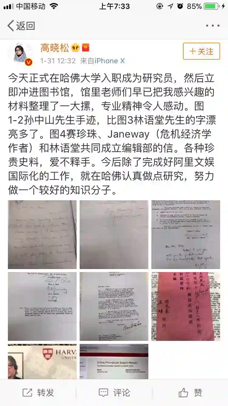 1月31日,高晓松在微博上宣布自己正式入职哈佛大学成为研究员。同时他还晒出了哈佛图书馆珍藏的各种珍贵史料,表示自己要在哈佛认真做点研究,“努力做一个较好的知识分子。 ”