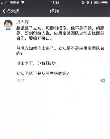一张截图显示,即刻方面表示,“有一些朋友过来问腾讯新上线的立知跟即刻什么关系这么像。应用宝某团队去年以应用商店搜索内容外显合作为名过来聊了几次,以合作的姿态提供了部分主体接口,转头就开始内测复刻版,当时确实没有想到还能有这种操作。