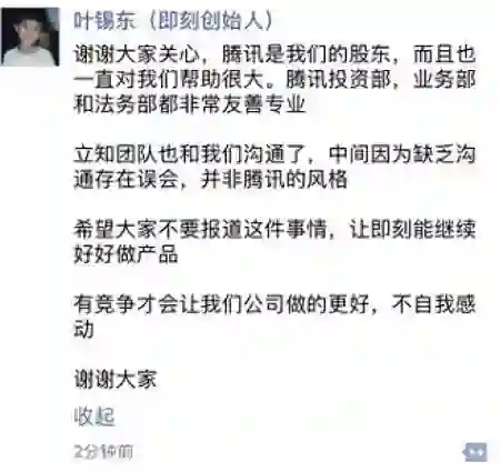 但随后即刻团队的又一张截图流出,称腾讯是股东,帮产品帮助很大,中间因缺乏沟通存在误会。