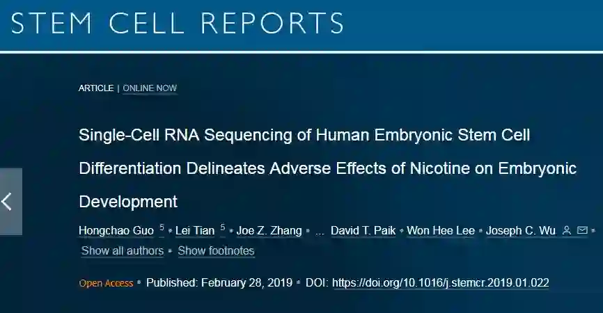 研究结果以题为“Single-Cell Sequencing of Human Embryonic Stem Cell Differentiation Delineates Adverse Effects of Nicotine on Embryonic Development(单细胞测序的人类胚胎干细胞分化划定不良尼古丁对胚胎发育的影响)”发表在《Stem Cell Reports》杂志上。