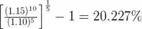 这是一道经典的期限结构的题目。你的脑海里第一反应应该是如下的思想:前五年的利率和后五年的利率必须是平均的,这样才能给出整个10年的利率。也就是说,10%的平均值和未知的远期利率必须是15%。未知的必须是20%。要快速计算出来,请注意,未知(20%)远高于平均值(15%)低于已知(10%)。