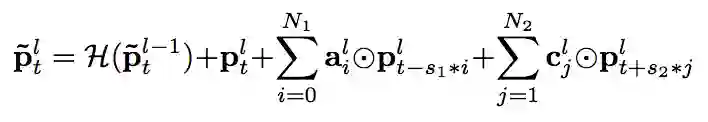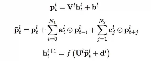 上文已经提到,除了直接增加各层的记忆模块的阶数之外,增加模型的深度也能间接增加预测当前帧的输出时模型可以利用的上下文的长度,上图给出了一个例子。