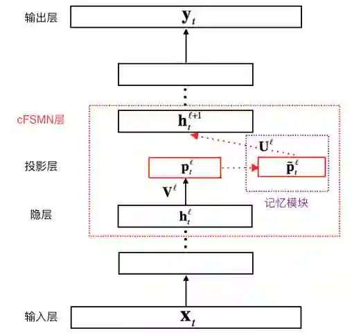 紧凑前馈序列记忆网络(cFSMN)作为标准的前馈序列记忆网络(FSMN)的改进版本,在网络结构中引入了低秩矩阵分解,这种改进简化了 FSMN,减少了模型的参数量,并加速了模型的训练和预测过程。