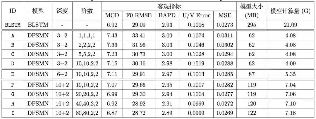 所有的 DFSMN 模型均由底层的若干 DFSMN 层和上的 2 个全连接层组成,每个 DFSMN 层包含 2048 个结点和 512 个投影结点,而每个全连接层包含 2048 个结点。在上图中,第三列表示该模型由几层 DFSMN 层和几层全连接层组成,第四列表示该模型 DFSMN 层的记忆模块的阶数和步长。由于这是 FSMN 这一类模型首次应用在语音合成任务中,因此我们的实验从一个深度浅且阶数小的模型,即模型 A 开始(注意只有模型 A 的步长为 1,因为我们发现步长为 2 始终稍好于步长为 1 的相应模型)。从系统 A 到系统 D,我们在固定 DFSMN 层数为 3 的同时逐渐增加阶数。从系统 D 到系统 F,我们在固定阶数和步长为 10,10,2,2 的同时逐渐增加层数。从系统 F 到系统 I,我们固定 DFSMN 层数为 10 并再次逐渐增加阶数。在上述一系列实验中,随着 DFSMN 模型深度和阶数的增加,客观指标逐渐降低(越低越好),这一趋势非常明显,且系统 H 的客观指标超过了 BLSTM 基线。