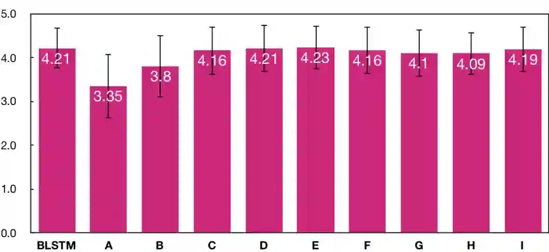 另一方面,我们也做了平均主观得分(MOS)测试(越高越好),测试结果如上图所示。主观测试是通过付费众包平台,由 40 个母语为中文的测试人员完成的。在主观测试中,每个系统生成了 20 句集外合成语音,每句合成语音由 10 个不同的测试人员独立评价。在平均主观得分的测试结果表明,从系统 A 到系统 E,主观听感自然度逐渐提高,且系统 E 达到了与 BLSTM 基线系统一致的水平。但是,尽管后续系统客观指标持续提高,主观指标只是在系统 E 得分的上下波动,没有进一步提高。