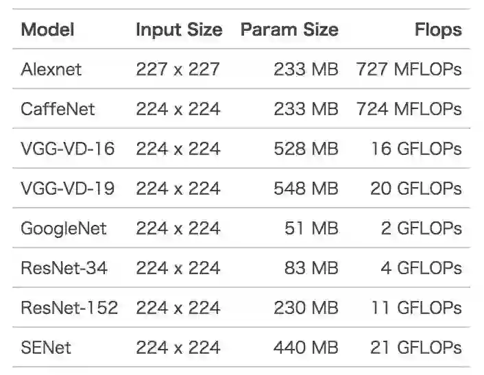 上表列举了,ImageNet图像识别中常见算法的模型大小以及单张图片一次训练(One Pass)所需要的计算量。