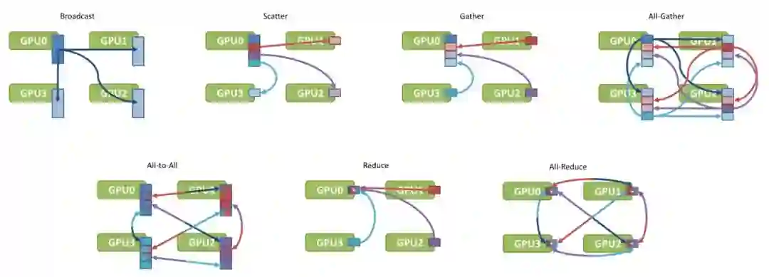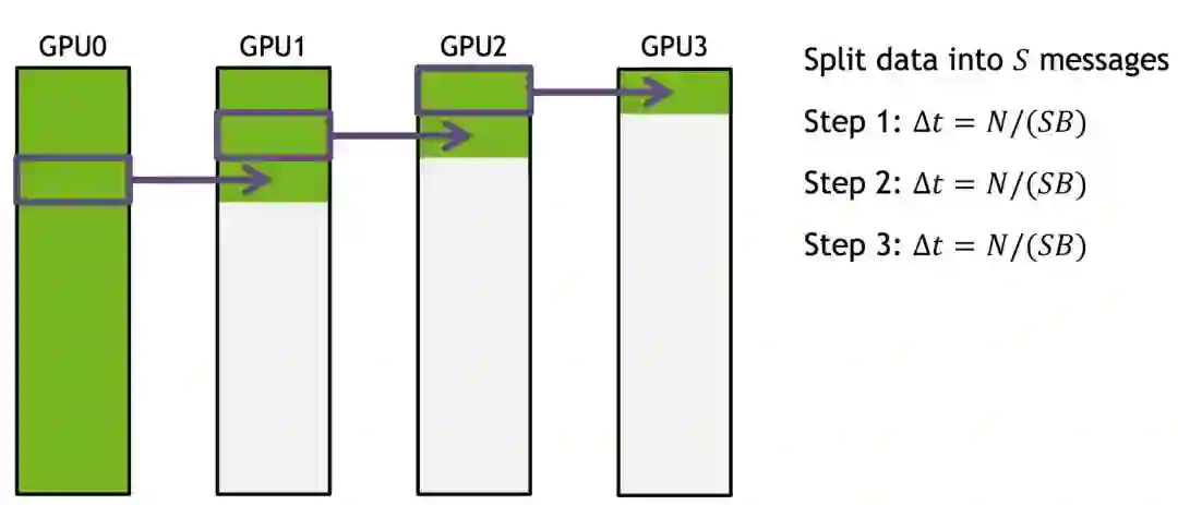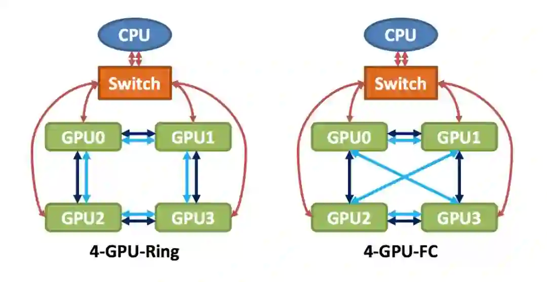 根据上面的数据结果,我们似乎可以得出一个结论:PCI-E和网络的传输耗时,相对于GPU来说,整整少了一个数量级,所以网络通信同步的时间可以忽略不计。然而问题并没有那么简单,上面例子中的耗时只是单个模型的耗时,但是对于8卡的集群来说,如果使用数据并行,每次同步就需要传输8份模型,这就导致数据传输的时间和GPU的计算时间“旗鼓相当”。这样的话,GPU就得每训练完一个Mini-batch,都得等候很久的一段时间(采取同步更新),这会浪费很多计算资源。因此,网络通信也需要制定对应的解决方案。下面我们以Nvidia NCCL中单机多卡的通信解决方案为例介绍,而多机多卡的通信解决方案其实是类似的。