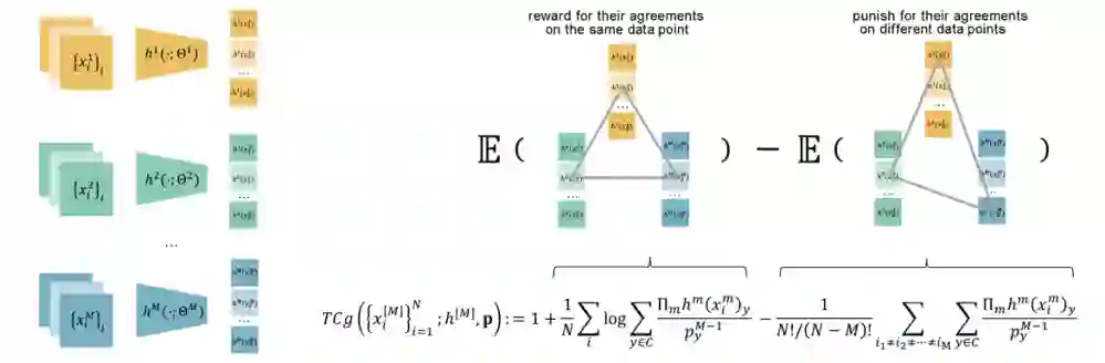 本文将这个问题转化为等价的半监督+多模态学习问题。在这个背景下,我们关注如何在训练中利用好未标注的多模态数据。本文的贡献在于,设计一个全相关(Total Correlation)的下界作为在未标注的多模态数据上的目标函数,来更好地融合跨模态的信息。全相关(Total Correlation)是关于多个随机变量之间共有信息的度量,在两个随机变量下全相关退化为互信息(Mutual Information)。