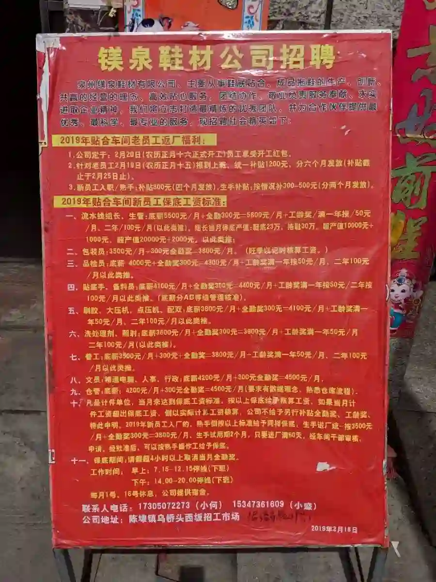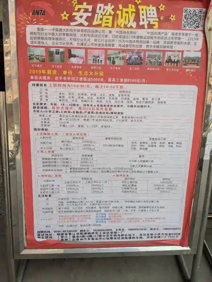六月暑期正值淡季,并不大的简易建筑在零星几家鞋企衬托下,显得格外空旷。贵人鸟、安踏、乔丹的招工板前,偶尔会出现一两个前来问询的人。红纸黄字写就的工资福利,大多超出我的常识范围。比如,辅导工人子女的四点钟学校、节后准时返岗奖励、带工奖,而熟悉的五险一金,却不见于字里行间。