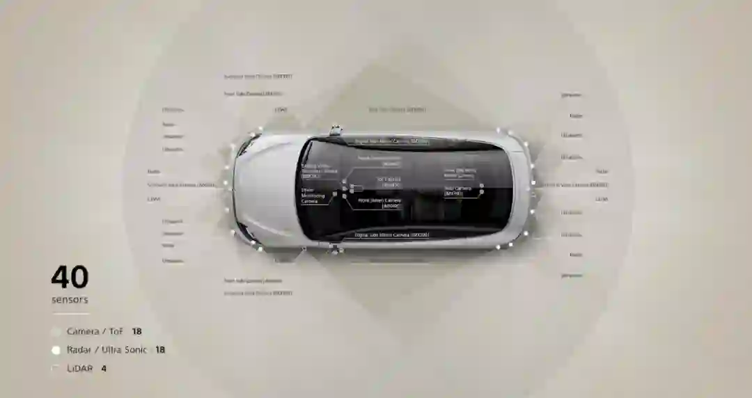 根据头部新势力企业对高级辅助驾驶和智能座舱关系的判断,加入这么多“非驾驶”功能一定需要足够强的辅助驾驶能力,把驾驶员从驾驶行为中解放出来。这时回看 2020 年初的 Vision-S 01,我们才发现索尼早就开始“卷”硬件了:4 个激光雷达,6 个毫米波雷达和足足 18 个摄像头,怎么看都是两年后才堆得出来的配置(其实到现在也不多)。Vision-S 01 宣称具备高速导航辅助驾驶和全自动泊车能力,在 2020 年 1 月相当罕见。
