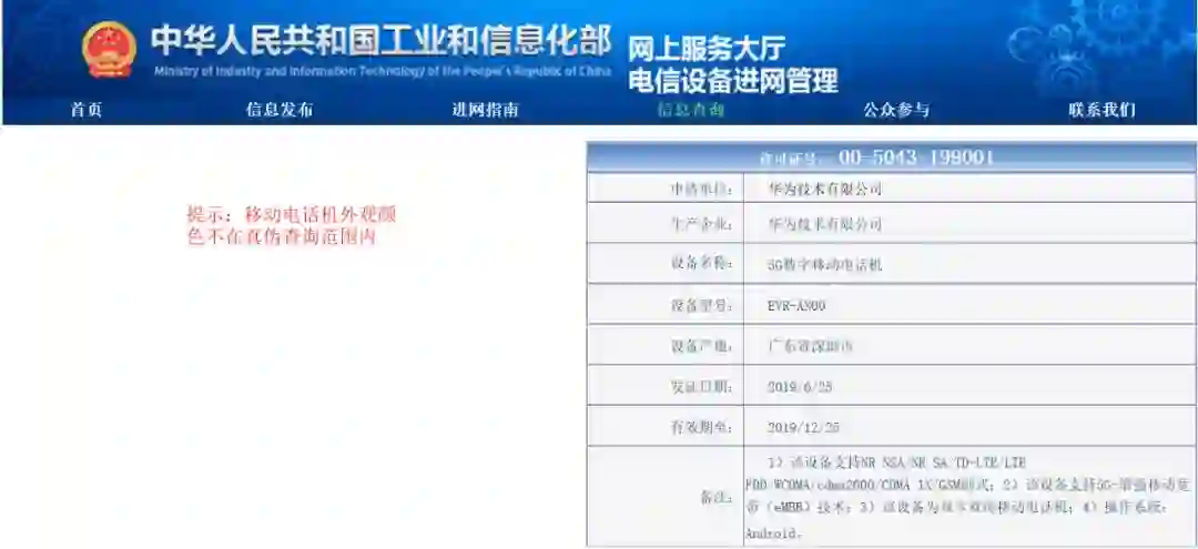 任何移动终端产品均需要取得国家检测机构发布的入网许可证,这是国家的法律法规要求,通常意义上的入网,是指终端厂商向工信部申请获得手机入网许可证。比如华为5G手机获得编号001的入网许可证,就是工信部颁发的。
