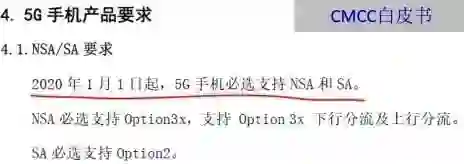 上图白皮书很明确显示,中国移动从2020年1月1日起,5G手机必选支持NSA和SA。注意,这是必选支持,并且是NSA和SA。请那些被“杨杰表示明年1月1日开始,政府不允许NSA手机入网”误导的人明确这个事实。