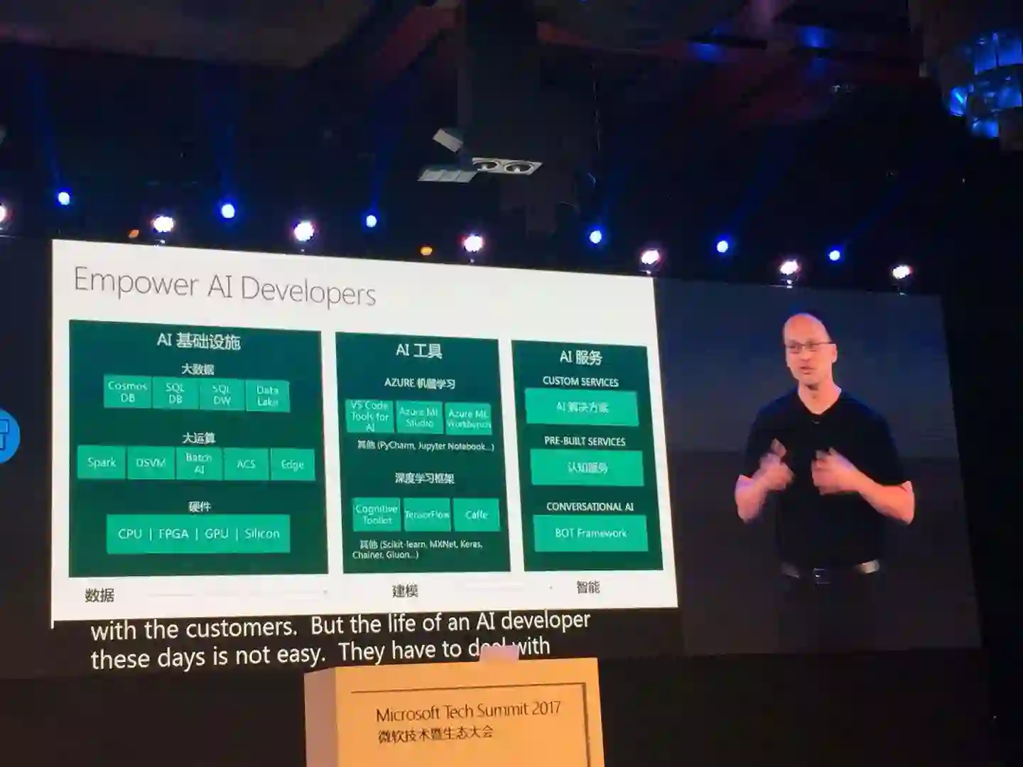 而值得开发者们格外关注的是,在此次大会上,微软推出了 Visual Studio Code Tools for AI,开发者可以用其进行可视化的 AI 编程。同时,还宣布了微软将为 AI 开发者提供从数据、到开发工具、再到服务的全方位的支持。