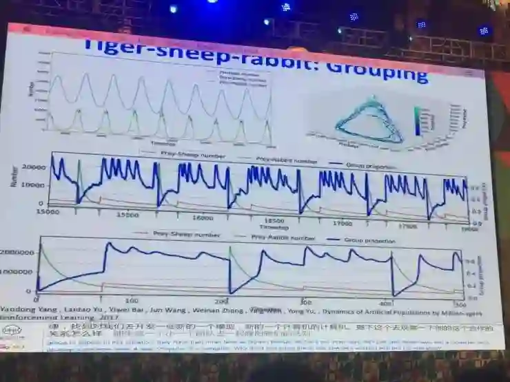 然后我们就给老虎学习的能力,发现它表现出的现象跟自然界里面的猞猁抓兔子的情况非常相似。有一点也觉得很意外,我们感觉一般来说当你的强化学习达到了最优点,它就停在那个地方。但是这个实验告诉我们,它是一个动态的平衡,我们把老虎和羊的数量用一个图反应出来,就会发现它形成一种圈状的形式,这个形式和这个LV模型非常相似。当然我们的情况是相对来说比那个LV模型要复杂一点,因为LV模型是一次性的一个简化模型,而我们这个地方考虑了各种情况,可以发现大致上它们是一个吻合的情况。所以我们发现在种群的情况下,如果有一个人工智体形成了种群,它和自然界有一定的内在联系。