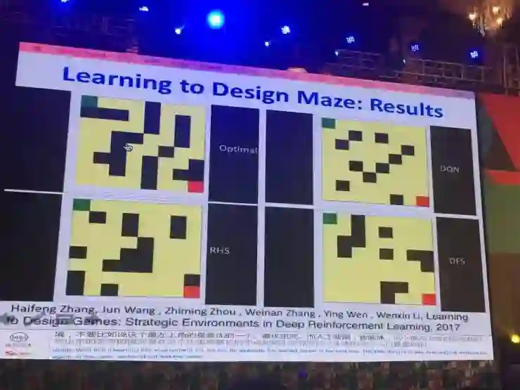我们发现很有意思的是,如图中所述,左上角是根据不同的人工智体的能力,会发现它学出来的环境是不一样的,比如说最左上角是我们有最优的一个人工智能体,在这个情况下,我们发现我们学出来这个迷宫的情况是在这个给定的8×8的方块下,它从入口到出口的路径是最长的,我们没有告诉你这个环境就要这样优化,它通过根据人工智能体之间的交互就学到了这一点。右上角是用了一个DQN模型,这个模型是一个概率性的模型,也就是说这个智体在每次选择走的时候,它有一定的概率走上走下,有一定的随机性,你会发现在这个情况下,学到的环境有很多岔路,这个岔路就是为了让有随机的人工智能体陷到一些支路里面,所以这样的环境对它来说是最困难的。
