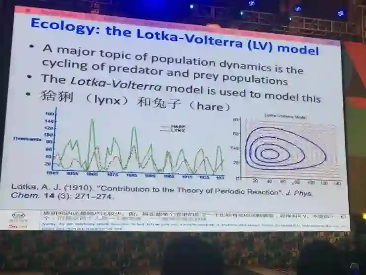 举一个简单的例子,其中有一个比较有名的模型简称LV (Lotka-Volterra) 模型,这是两个人的名字组合,一个是数学家、一个是生物学家,以他们的名字命名这个模型。这个模型是在描述在竞争的两个种群的情况下,它们的种群数量之间的动态关系。在自然界里面,生物学家或者是生态学家发现,种群之间的数量不是一个静态的过程,其实是一个动态的、互相约束的过程。比如说猞猁是兔子的天敌,假设只有猞猁和兔子之间的关系,其它的因素不考虑,我们会发现当猞猁的数量提高的时候,兔子的数量相对来说就要降低,当猞猁的数量降低的时候,兔子的数量就会增高,它们就形成了一种互动的关系,这种关系就可以用LV模型描述。